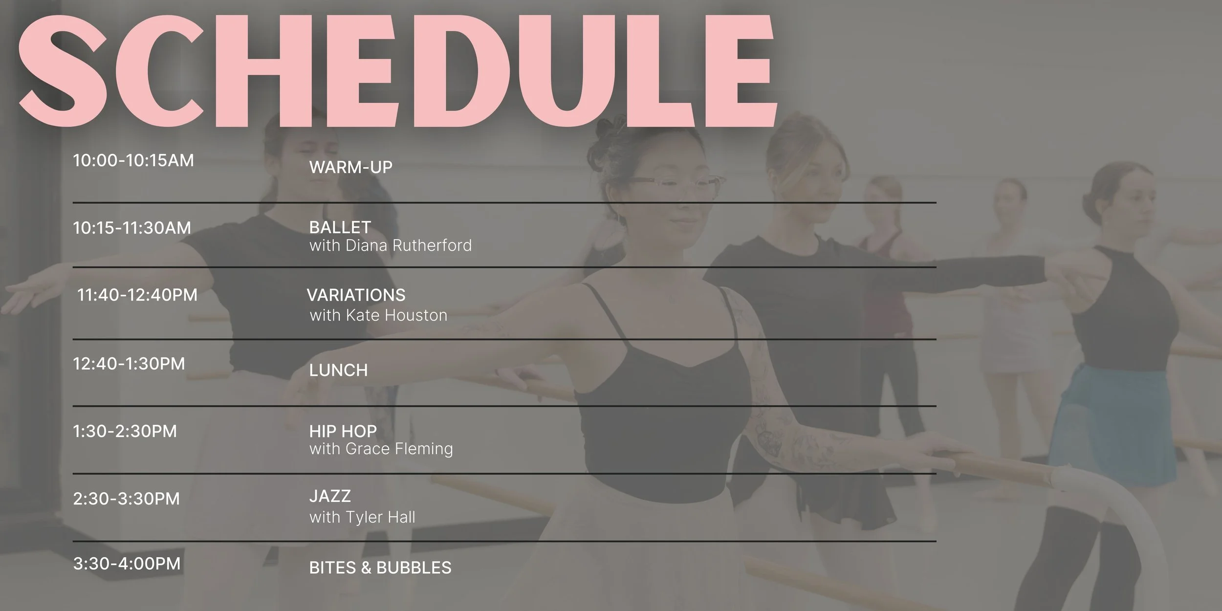 Our open-level adult dance intensive is taking place on March 21st from 10:00am-4:00pm. This one-day workshop will feature classes in Ballet, Variations, Hip Hop, and Jazz, offering our adult dancers the chance to explore multiple styles in a focused and inspiring environment.